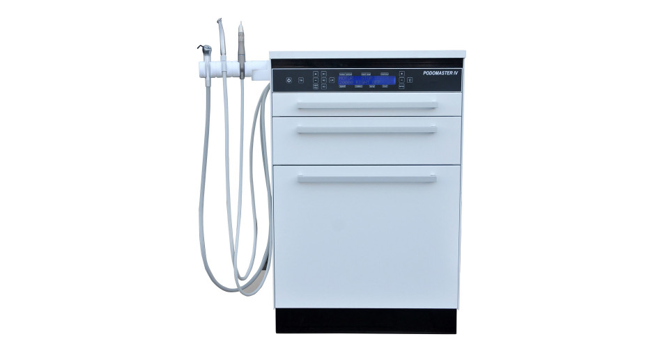 De Podomaster 4 is een plug-and play pedicure unit met ingebouwde, geluidsarme compressor voorzien van een groot drukvat en biedt veel bedieningsgemak en comfort, dit is een uitgebreide versie van de Podomaster III met digitale bediening.